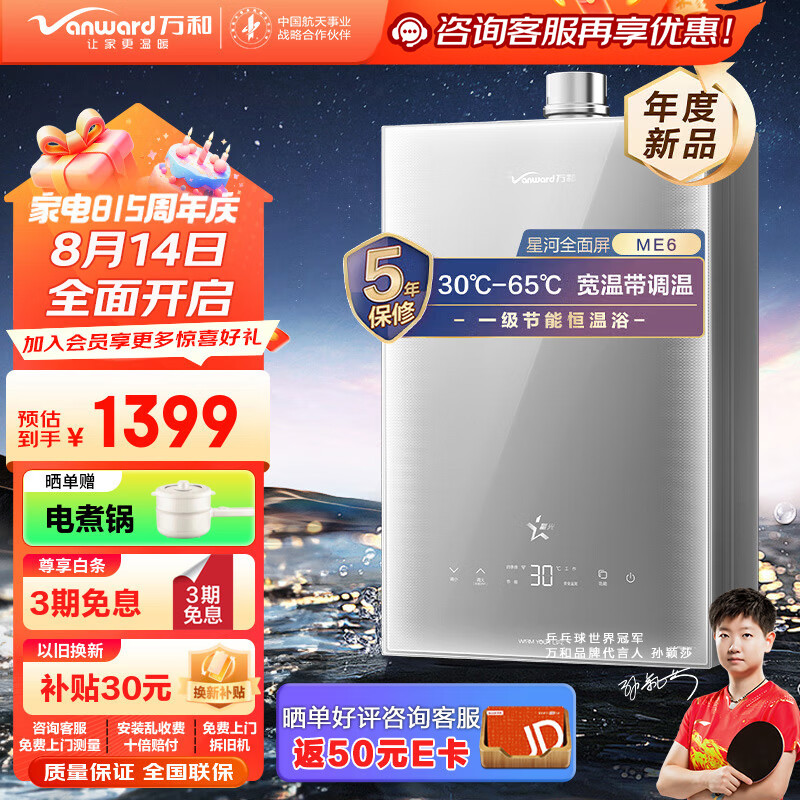 万和(Vanward)【星光】燃气热水器16升天然气 玻璃面板 节能AI水气双伺服 智能 恒温浴 JSQ30-ME6W16 以旧换新价格:1399.00元!
