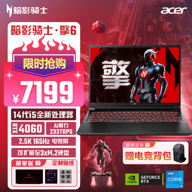 宏碁(acer) 暗影骑士·擎6 16英寸游戏本 2.5K 165Hz电竞屏 笔记本电脑(i5-14450HX 16G 1TB RTX4060)价格:7199.00元!