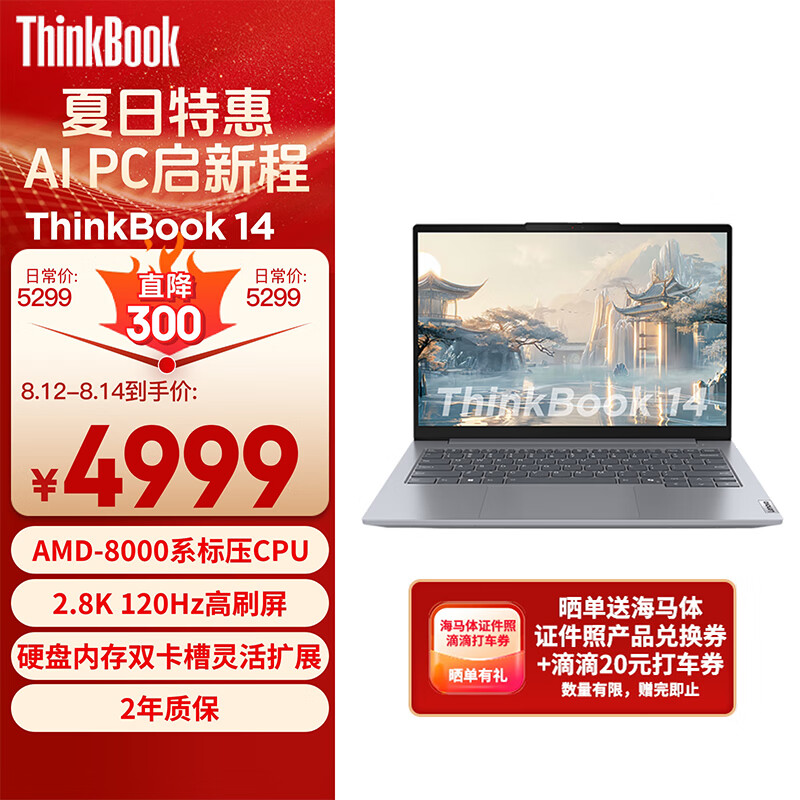 ThinkPad联想笔记本电脑ThinkBook 14 2024 锐龙版 R7-8845H 14英寸 16G 1T 2.8K AI高刷屏办公价格:4999.00元!