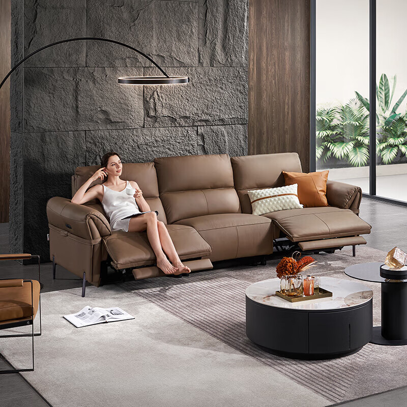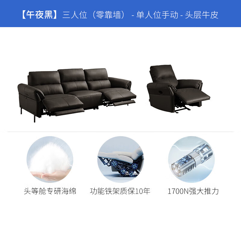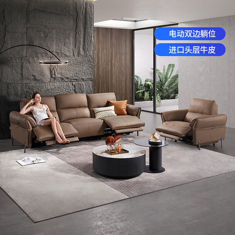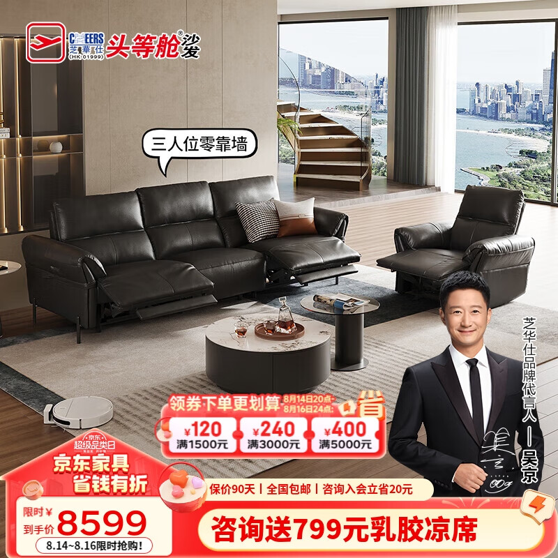 芝华仕(CHEERS)头等舱零靠墙意式轻奢真皮功能沙发户型直排客厅芝华士50795黑3+1价格:8599.00元!