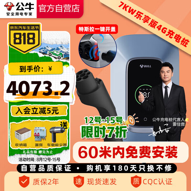 公牛新能源汽车交流充电桩适配于小米SU7汽车特斯拉比亚迪极氪问界小鹏理想蔚来 7KW乐享4G款 60米安装价格:5819.00元!