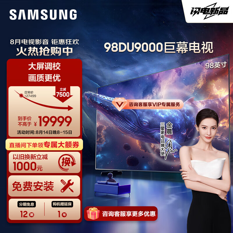 三星(SAMSUNG)98DU9000 98英寸 AI电视 超薄4K屏 智能补帧 无开机广告 大屏影院 UA98DU9000JXXZ价格:19999.00元!