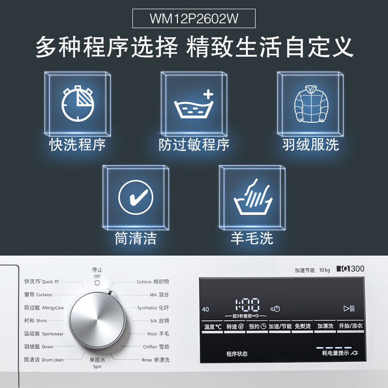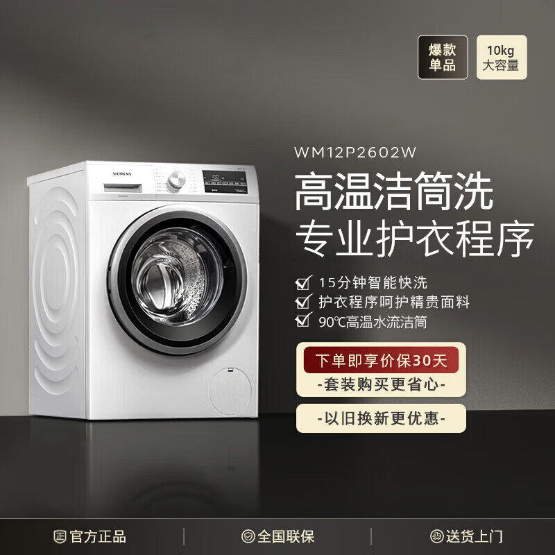 西门子(SIEMENS)10公斤滚筒洗衣机全自动 BLDC变频电机 15分钟快洗 混合洗 防过敏 XQG100-WM12P2602W价格:13368.00元!
