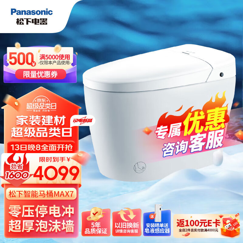 松下(Panasonic)智能马桶MAX7泡沫盾低水压家用全感应停电冲X7系列 一体机300mm价格:5099.00元!