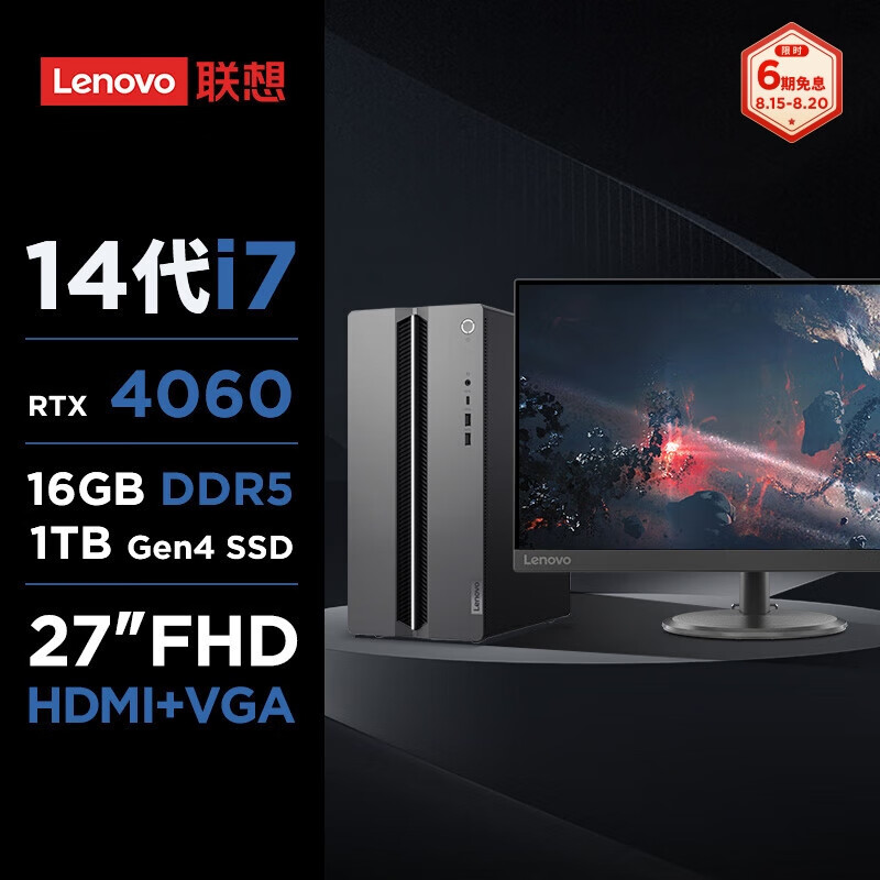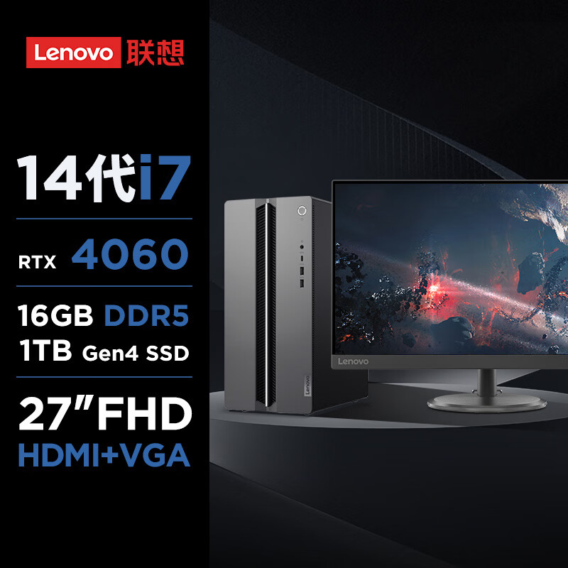 联想(Lenovo)GeekPro设计师游戏台式电脑主机(酷睿14代i7-14700F RTX4060 8GB显卡 16G DDR5)27英寸显示器价格:8799.00元!