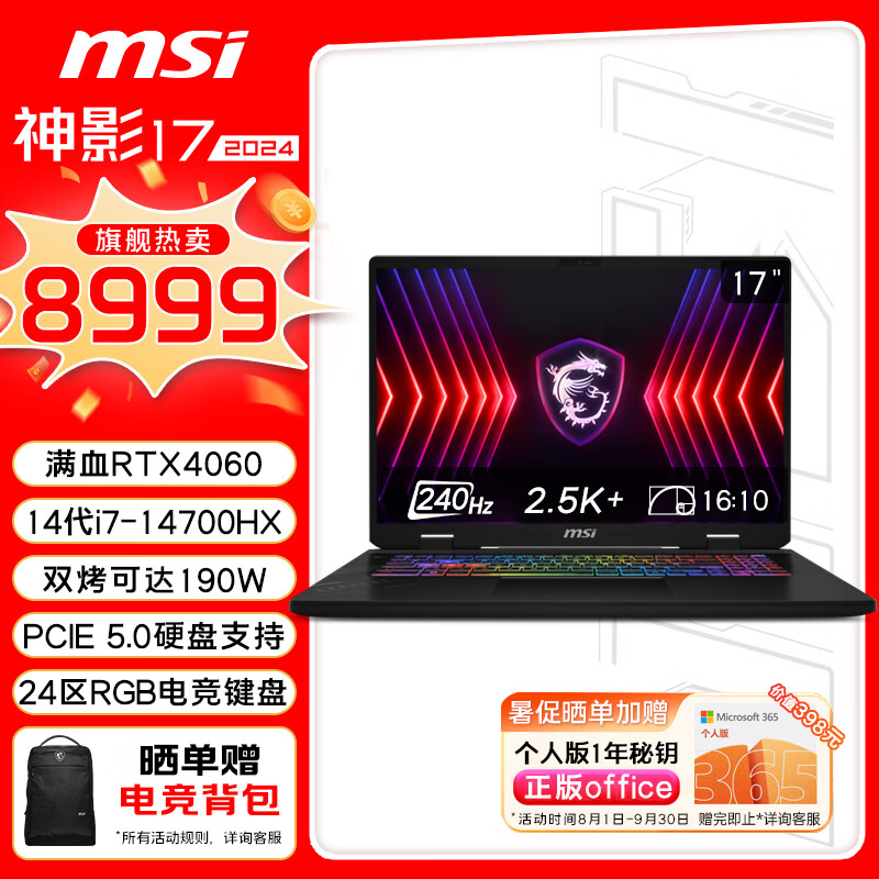 微星(MSI)神影17 2024 14代酷睿i7-14700HX 17英寸游戏本笔记本电脑( RTX4060 16GB 1T 2.5K 240Hz )价格:8999.00元!