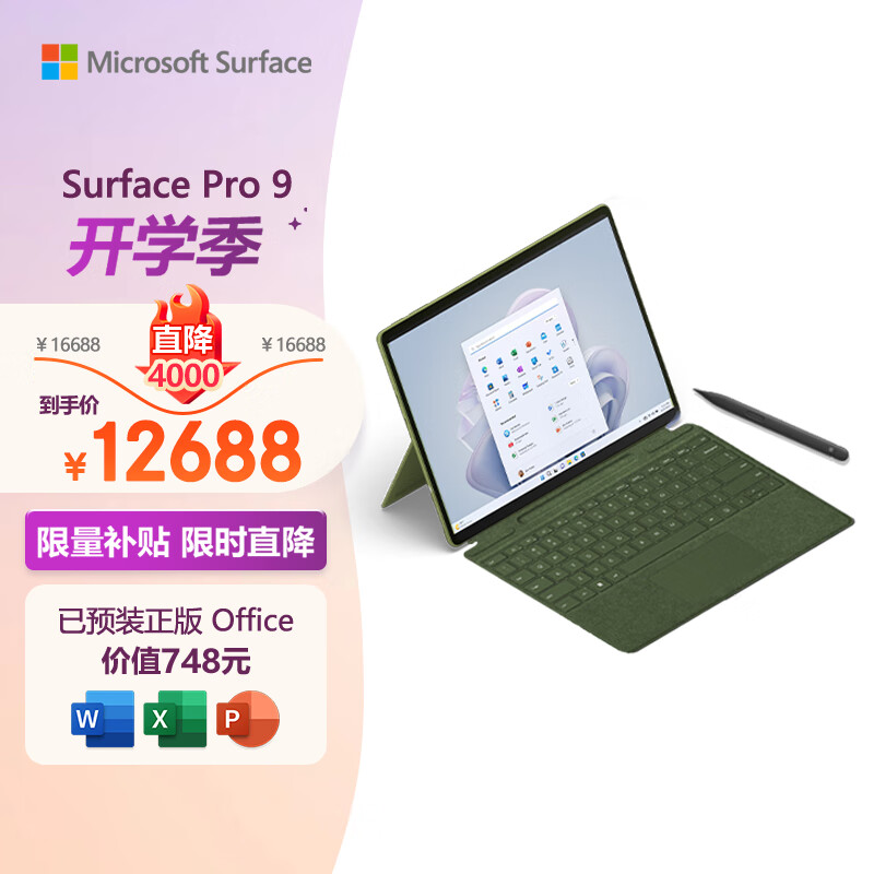 微软Surface Pro9 森野绿+森野绿带触控笔键盘盖i7 16G+512G二合一平板电脑13英寸120Hz触控屏游戏平板价格:12688.00元!