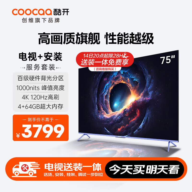 酷开【送装一体版】创维Max75 75英寸电视 百级分区 1000nits峰值亮度 120Hz高刷智能平板电视机75P5E价格:3799.00元!