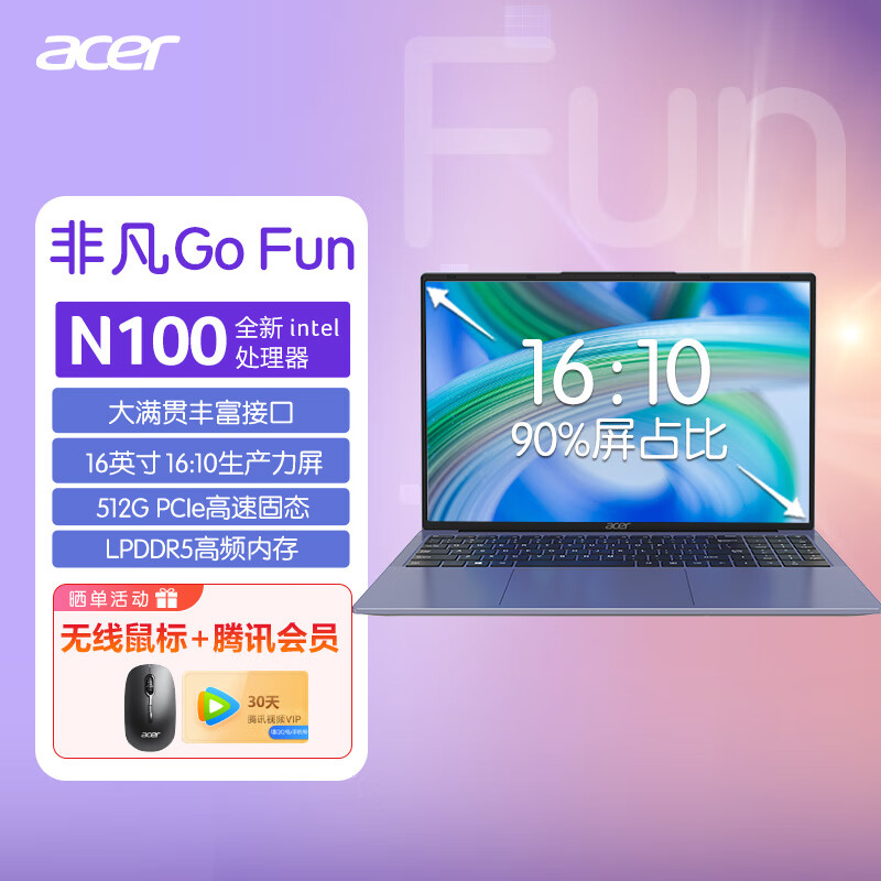宏碁(acer)非凡Go Fun 16英寸轻薄本 教育办公笔记本电脑(英特尔四核N100 8G 512G固态 IPS全高清Win11)灰价格:2099.00元!
