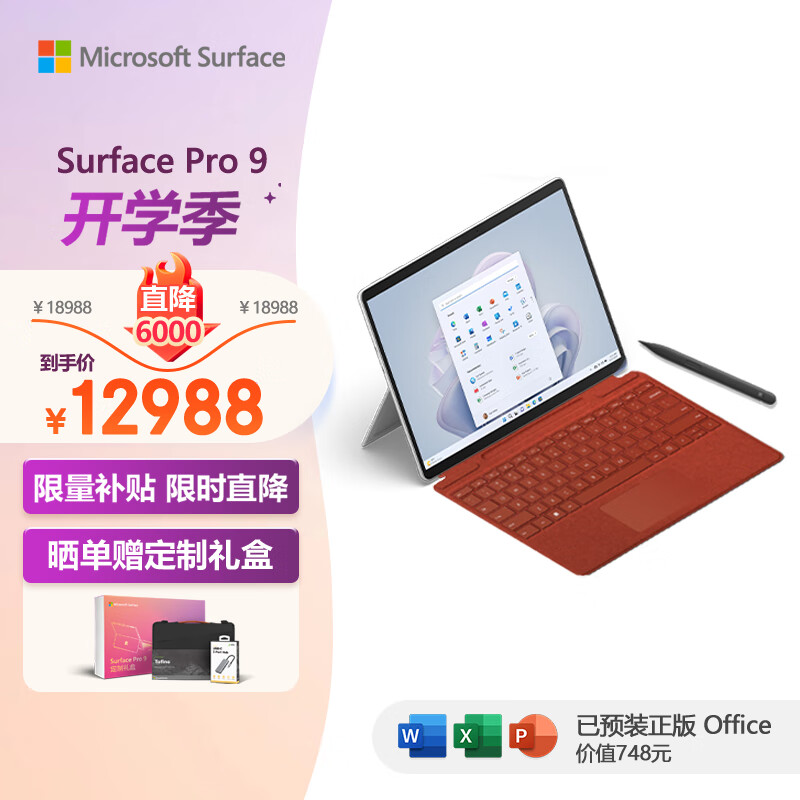 微软Surface Pro9 亮铂金+波比红带触控笔键盘盖i7 16G+1T二合一平板电脑13英寸120Hz触控屏游戏笔记本价格:12988.00元!