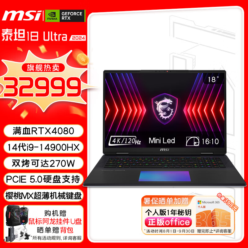 微星(MSI)泰坦18Ultra 2024 14代酷睿i9-14900HX 18英寸旗舰游戏笔记本电脑(64GB 2T RTX4080 4K MiniLED)价格:32999.00元!