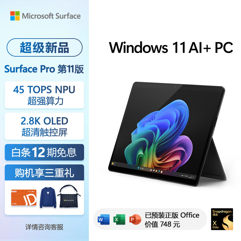 微软(Microsoft)全新Surface Pro第11版 骁龙X Elite 16G 1T 典雅黑二合一平板笔记本电脑 学生平板 AIPC Pro 11价格:13288.00元!