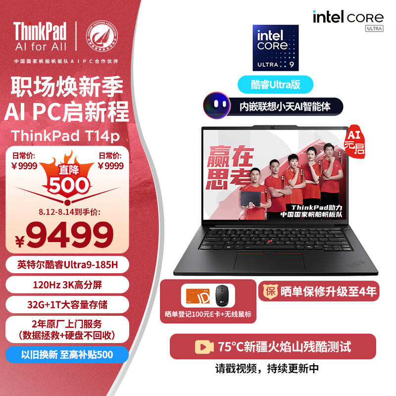 ThinkPad T14p AI PC 酷睿Ultra9 185H标压 14.5英寸高性能工程师本笔记本电脑 32G 1TB 3K 商务办公本价格:9499.00元!