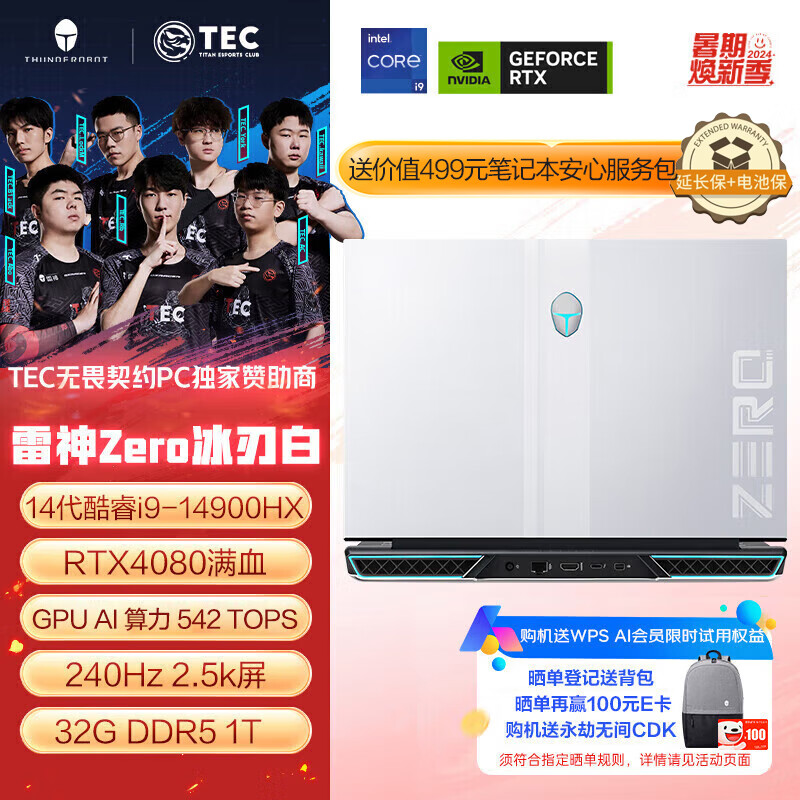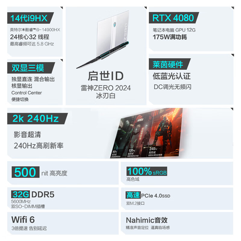 雷神(ThundeRobot) Zero 16英寸游戏本笔记本电脑(14代酷睿24核i9-14900HX 32G DDR5 1T RTX4080 240Hz 2.5K屏)价格:14999.00元!