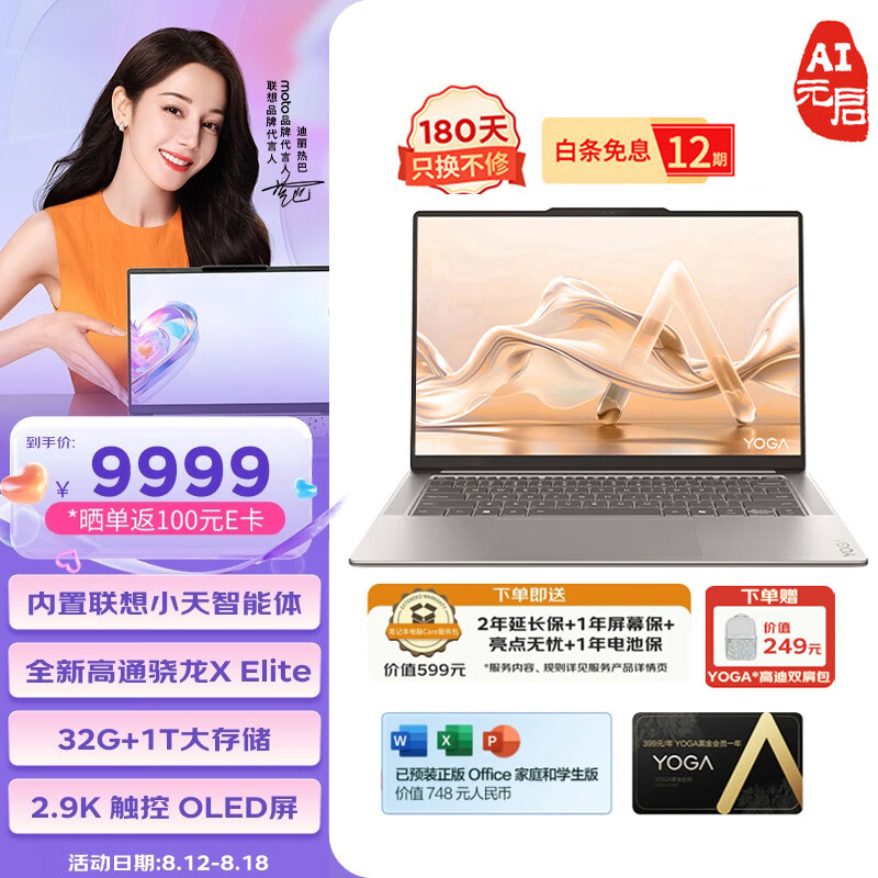 联想YOGA Air 14s 骁龙 AI元启 14.5英寸轻薄笔记本电脑 骁龙X Elite 32G 1T 2.9K 广色域 触控OLED价格:9999.00元!