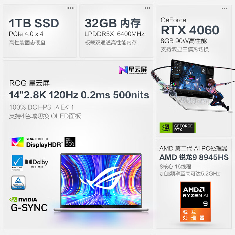 ROG幻14 Air 14英寸 锐龙9轻薄高性能游戏本笔记本电脑(R9 8945HS 32G 1T RTX4060 2.8K 120Hz)铂月白价格:12969.00元!