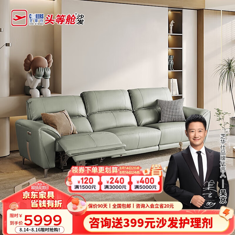 芝华仕(CHEERS)头等舱零靠墙真皮沙发现代功能客厅直排家具芝华士50953绿三价格:5999.00元!