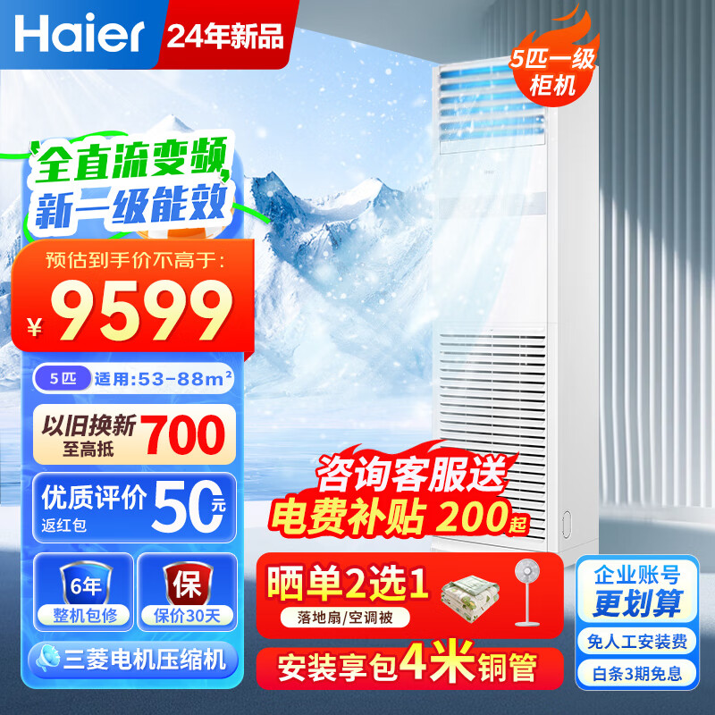 海尔(Haier)5匹柜式空调 中央空调 5p柜机 一级能效 变频商用店铺 立式空调380V KFRd-120LW/7YAF81 包4米铜管价格:9599.00元!
