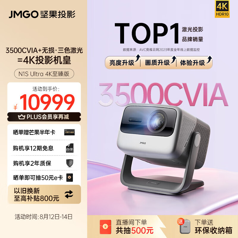坚果投影(JMGO)N1S Ultra 4K至臻版 超高清三色激光云台投影仪家用家庭影院(升级3500CVIA+新一代无损三色激光)价格:10999.00元!