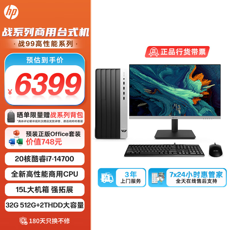 惠普 战99 高性能生产力台式电脑主机(酷睿14代i7-14700 32G大内存 512G+2T)23.8英寸高刷 满配办公价格:6399.00元!