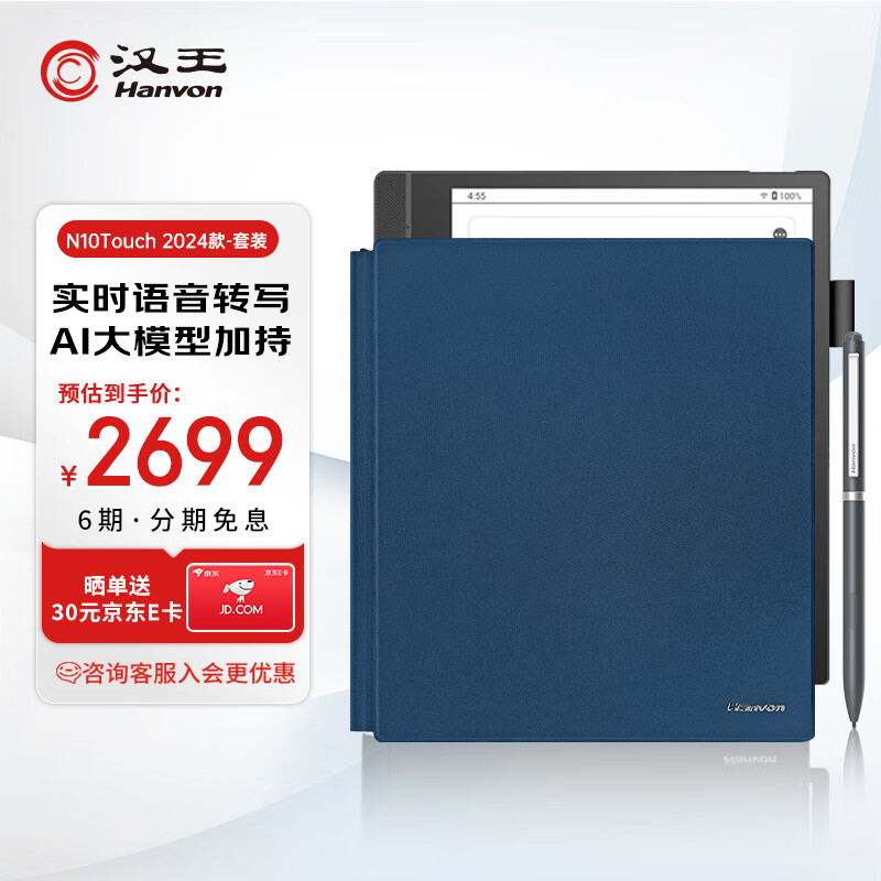 汉王电纸书N10touch 2024款智能办公本10.3英寸电子书阅读器墨水屏手写电纸书 蓝色保护套套装价格:2699.00元!