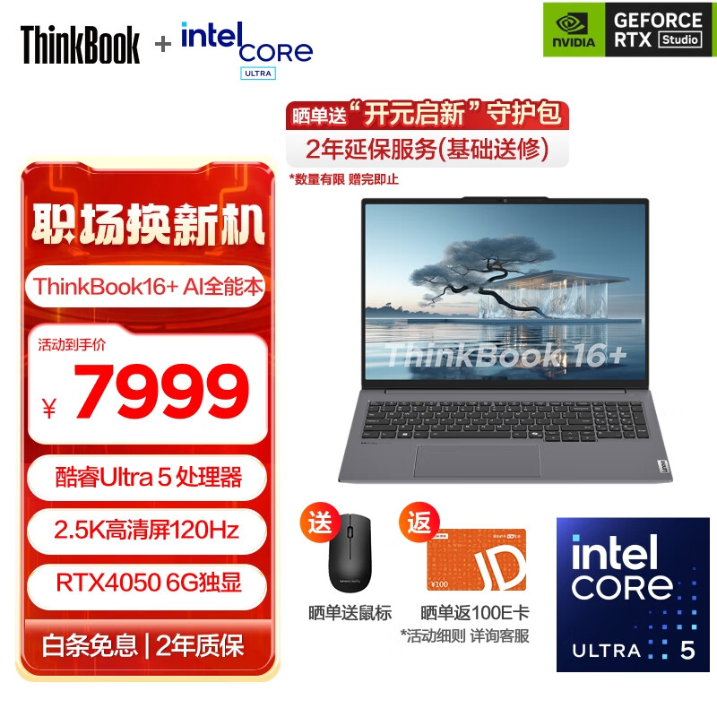ThinkPad联想ThinkBook16+2024 AI全能本 全新英特尔酷睿Ultra标压处理器 16英寸轻薄学生办公笔记本电脑 Ultra5 16G 512G 0SCD独显价格:7999.00元!