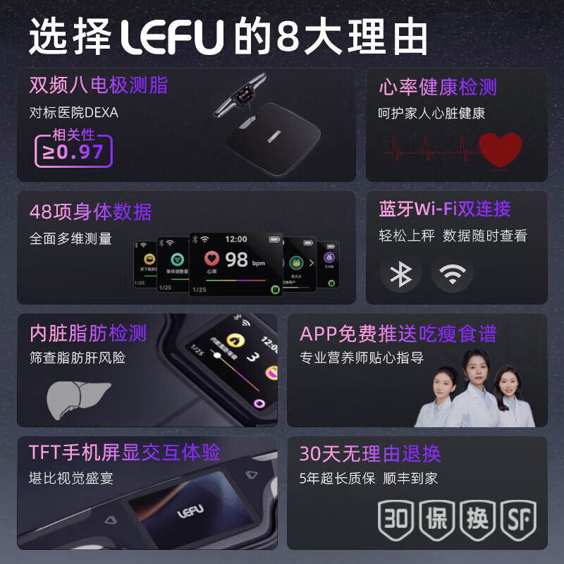 乐福能量云LEFU智能八电极体脂秤健身房减肥专用精准体重秤家用电子秤人体称重秤高精度双频测脂仪价格:799.00元!