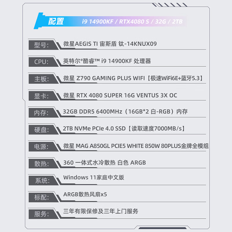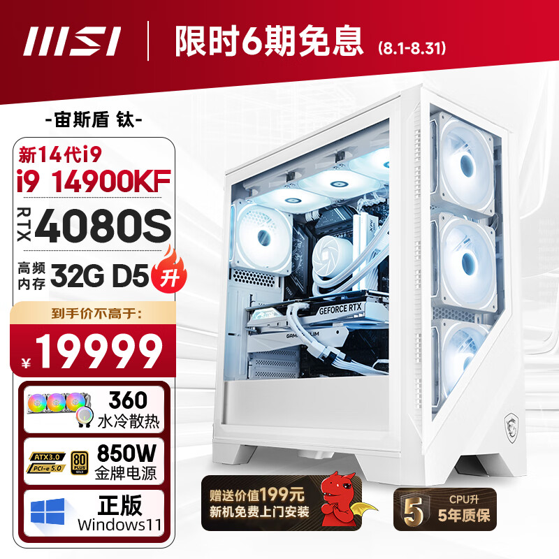 微星(MSI)宙斯盾Ti i9 14900KF/RTX4080Super/32G DDR5/2T 水冷电竞游戏设计师台式电脑主机全套diy组装整机价格:20999.00元!