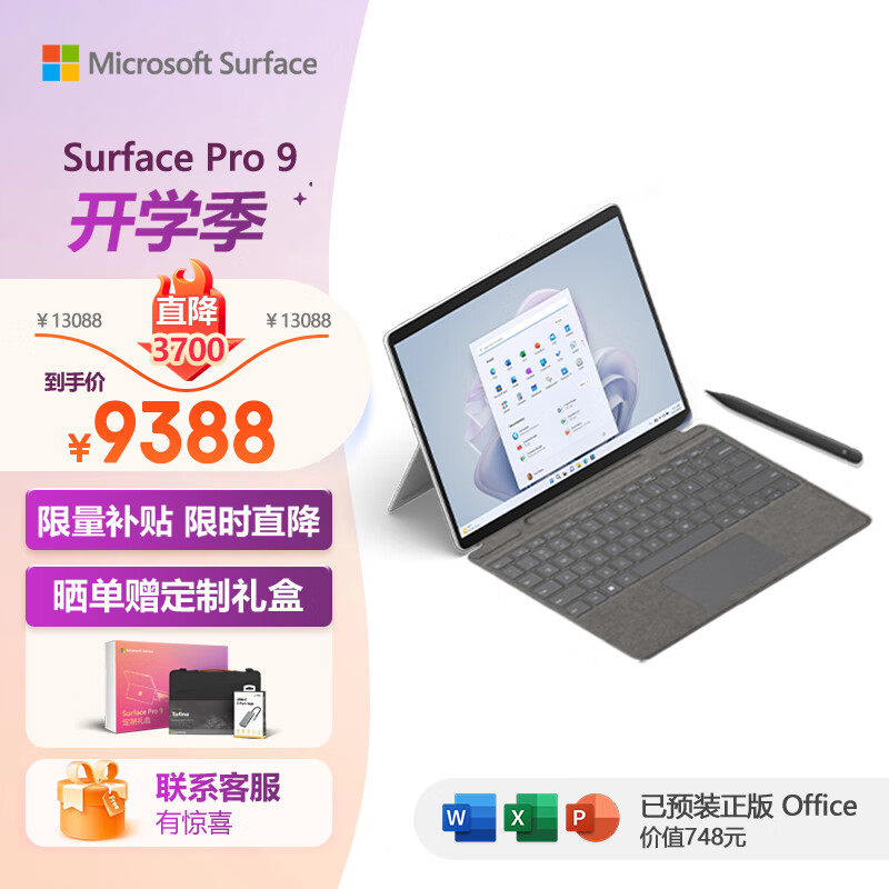微软Surface Pro 9 亮铂金+亮铂金带触控笔键盘盖i5 16G+256G 二合一平板电脑13英寸120Hz触控屏笔记本价格:9388.00元!