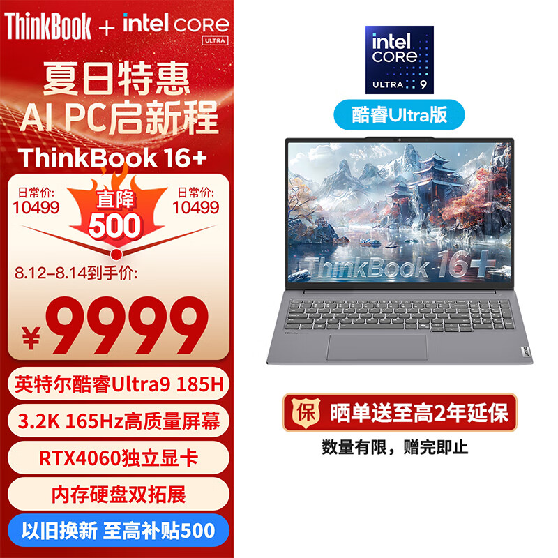 ThinkPad联想笔记本电脑ThinkBook 16+ 2024 AI全能本 英特尔酷睿Ultra9 185H 16英寸 32G 1T 3.2K RTX4060价格:9999.00元!
