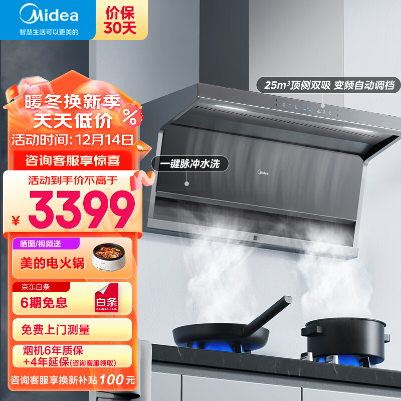 美的(Midea)抽油烟机?家用顶侧双吸 25风量 大吸力 高压水洗 超薄近吸7字型 排抽油烟机 星耀灰DC9价格:3399.00元!