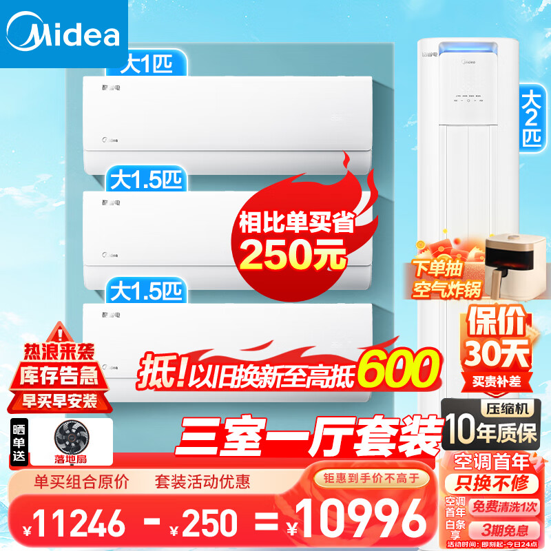 美的(Midea)空调套装三室一厅套餐一套购齐 新能效变频挂机柜机 2匹酷省电PRO+酷省电/风酷/极酷/冷静星/青春价格:10696.00元!