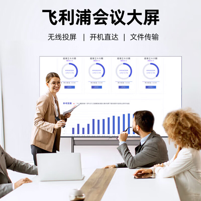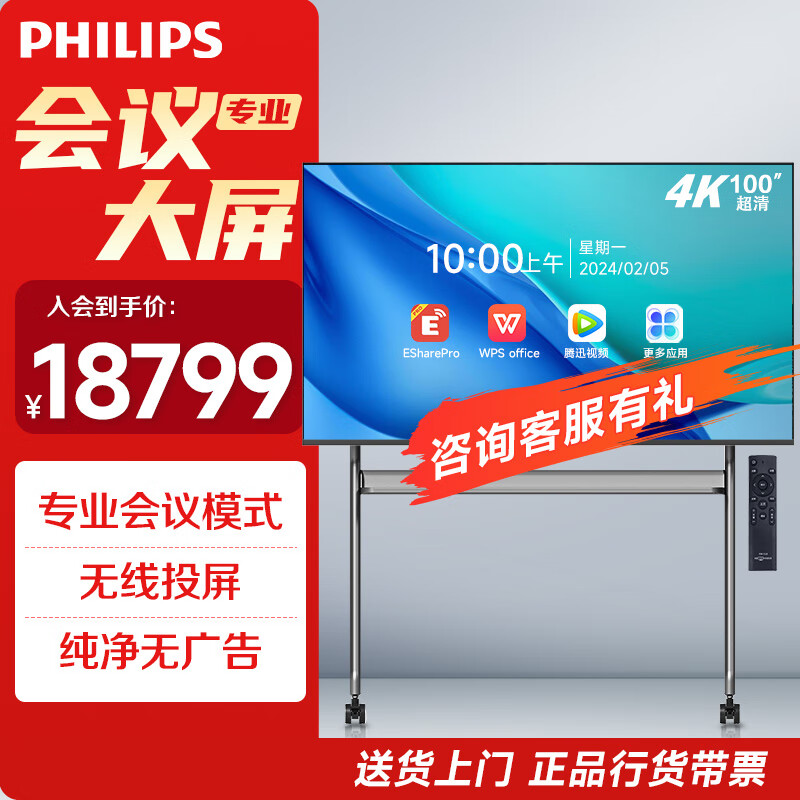 飞利浦100英寸会议平板一体机 4K超清会议大屏非触控无线投屏智能办公教学培训商用显示移动智慧屏2250Q推车价格:18799.00元!
