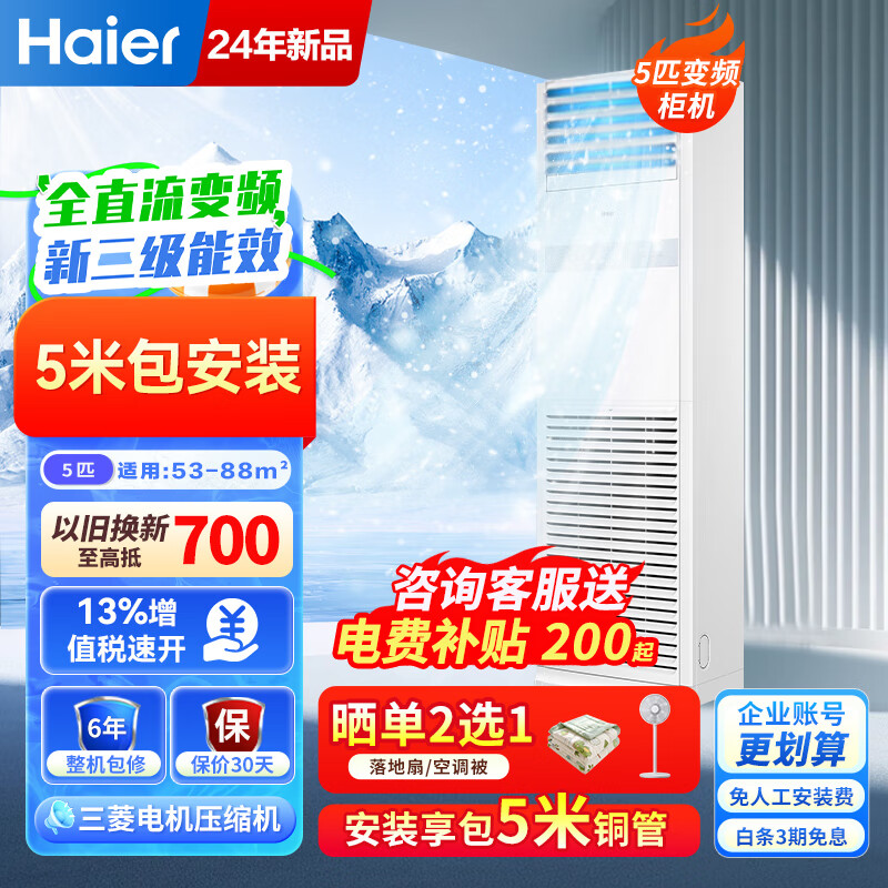 海尔(Haier)5匹柜式空调 商用中央空调5P立式柜机变频冷暖 三菱压缩机 二级能效380V办公室商铺门面 包5米铜管价格:8999.00元!