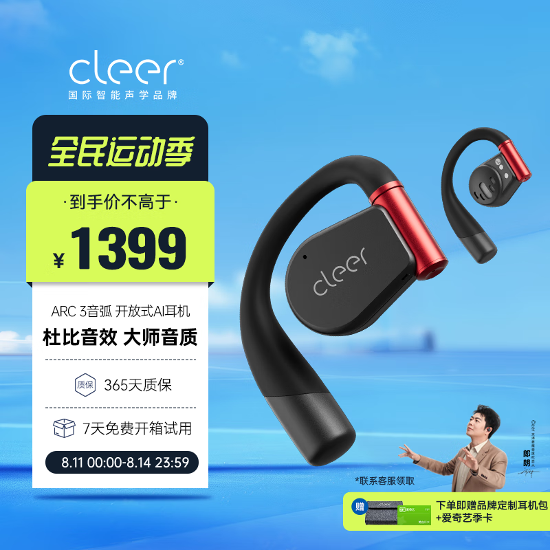 cleer郎朗推荐开学必备ARC3不入耳开放式杜比空间音频AI智能无线蓝牙运动耳机挂耳式骨传导升级适用华为 暗夜红【运动版】价格:1399.00元!