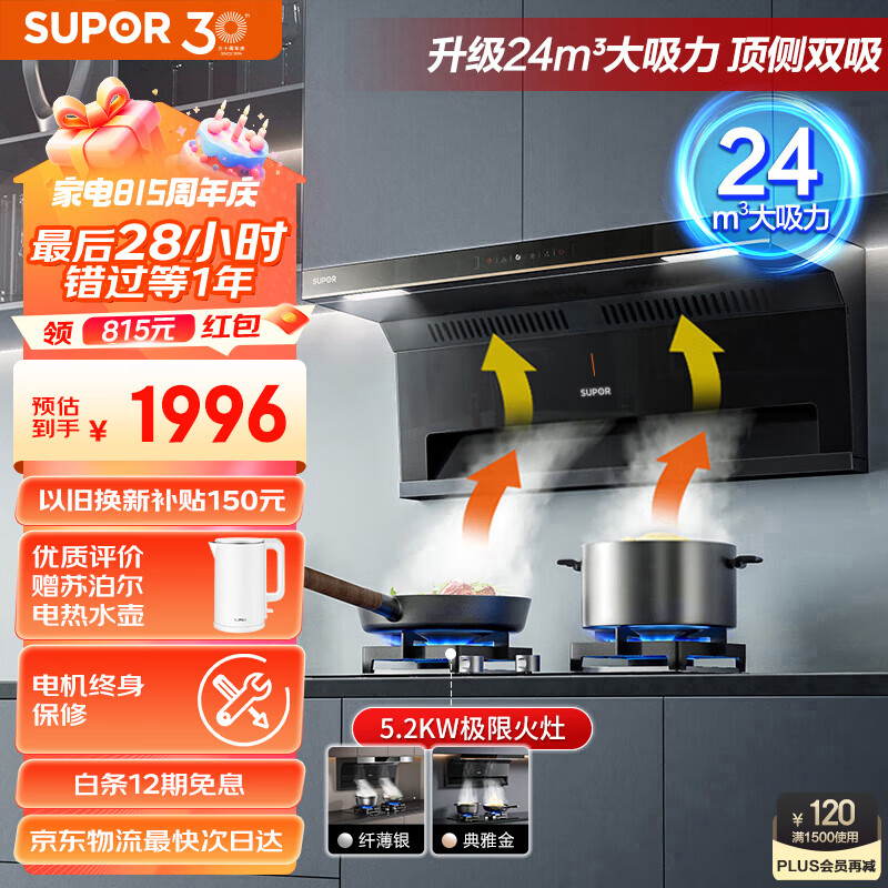 苏泊尔(SUPOR) 抽油烟机 顶侧双吸7字型烟灶套装24立方挥手免拆洗家用烟机燃气灶具套装DE15+DB27天然气价格:1996.00元!