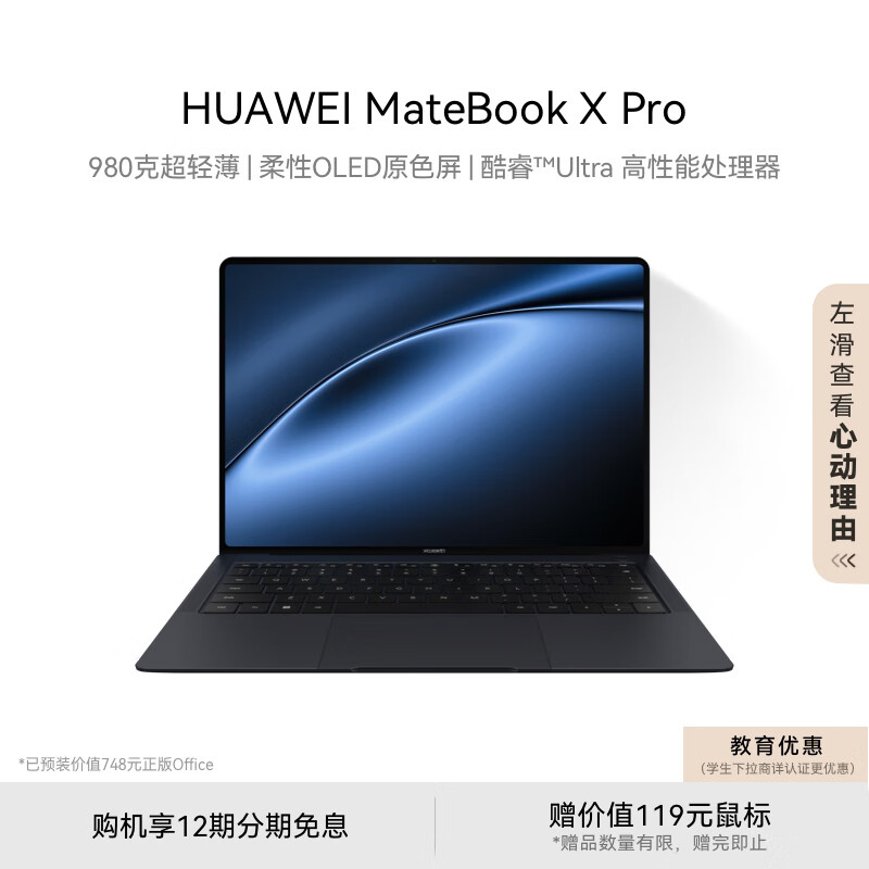 华为MateBook X Pro酷睿 Ultra 微绒典藏版笔记本电脑 980克超轻薄/OLED原色屏 Ultra7 16G 1T 砚黑价格:11199.00元!