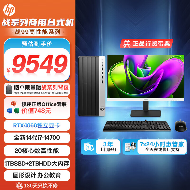 惠普 战99 游戏台式电脑主机(14代i7-14700 32G 1T+2THHD RTX4060)高性能Ai算力 大模型训练 2K大屏价格:9549.00元!