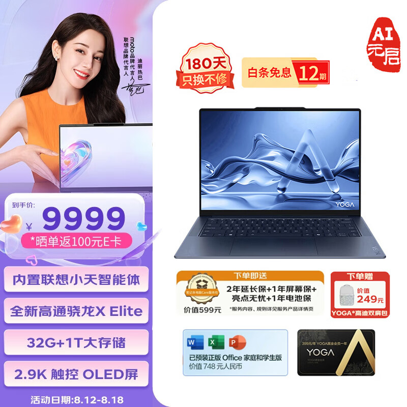 联想YOGA Air 14s 骁龙 AI元启 14.5英寸轻薄笔记本电脑 骁龙X Elite 32G 1T 2.9K 广色域触控OLED价格:9999.00元!