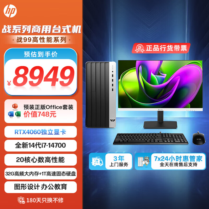 惠普 战99 24款 RTX游戏高性能 设计师台式电脑主机(酷睿14代i7-14700 32G 1T RTX4060)2K 27英寸大屏价格:8949.00元!