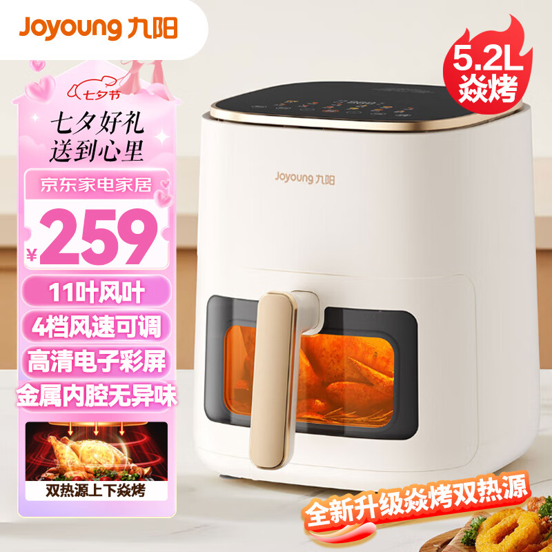 九阳(Joyoung)焱烤不用翻面 全金属内腔 电子彩屏触控蒸汽嫩炸空气炸锅 家用5.2L大容量 薯条机电炸锅KL50-V566Y价格:259.00元!