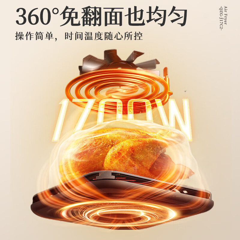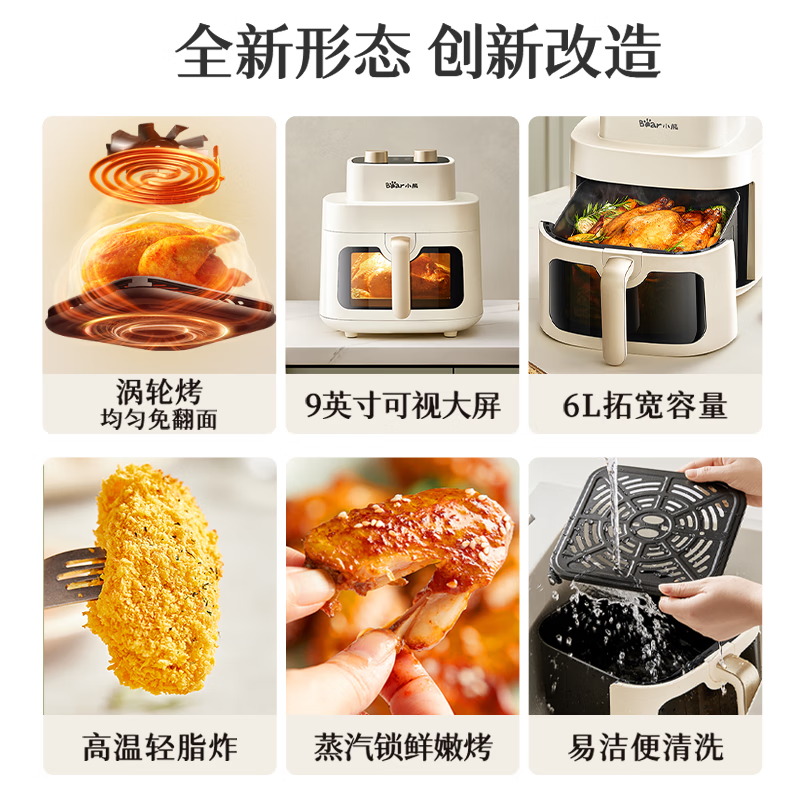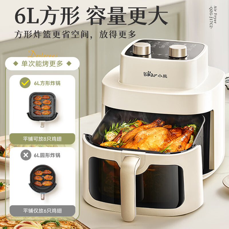 小熊(Bear)空气炸锅 不用翻面 全自动 家用6L大容量 可视 聚风环包裹烤 低脂空气炸 免翻面QZG-J17C2价格:269.00元!