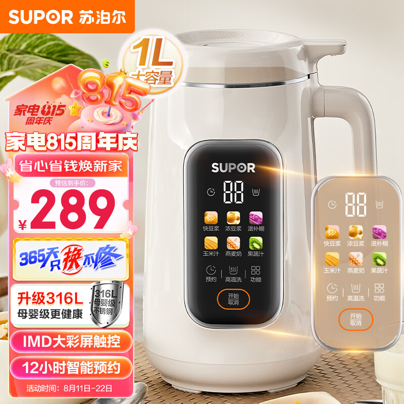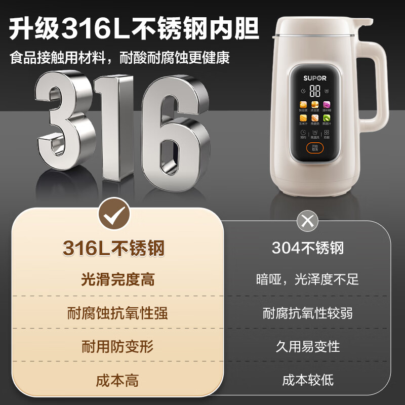苏泊尔(SUPOR)豆浆机家用1L小型全自动清洗免煮免过滤破壁料理机316L不锈钢内胆双层防烫搅拌机DJ10B-P28E价格:289.00元!