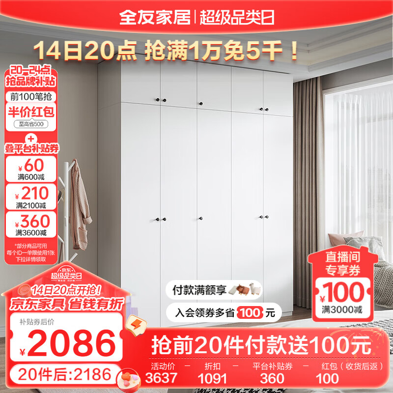 全友家居 衣柜简约风卧室衣物收纳纯色百搭多规格平开门家具DG10009价格:3637.14元!