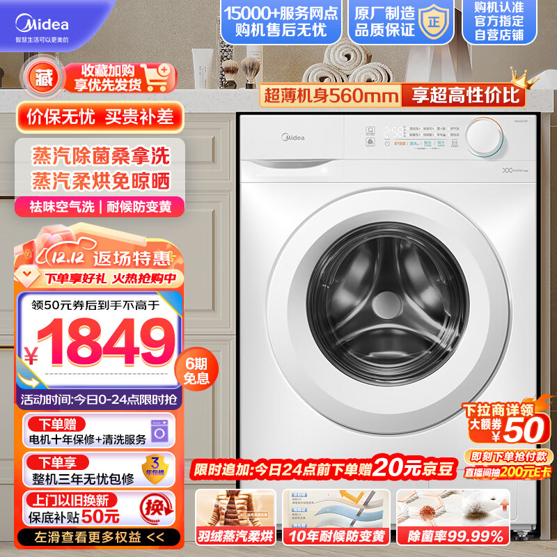 美的(Midea)滚筒洗衣机全自动 超薄机身560mm 巴氏除菌洗 洗烘一体 蒸汽柔烘 MD100V11F 简尚系列 10公斤价格:1899.00元!