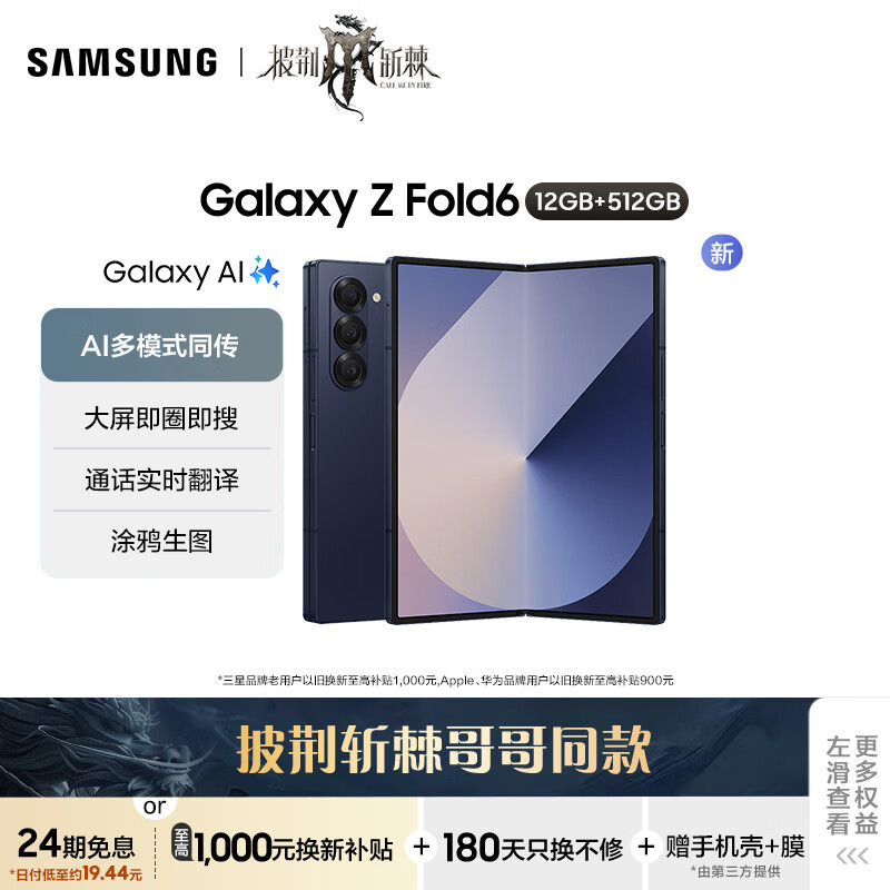 三星(SAMSUNG)Galaxy Z Fold6 大屏AI手机 超轻薄折叠屏手机 第三代骁龙8 游戏手机 12GB+512GB 冷夜蓝价格:13999.00元!