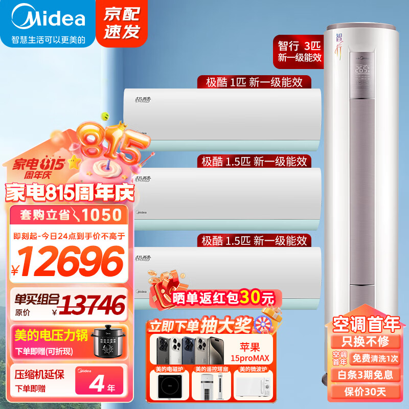 美的(Midea)空调套装 新一级能效 三室一厅 双节能低噪 自清洁 挂机(1匹+1.5匹*2极酷)+柜机3匹智行价格:12696.00元!