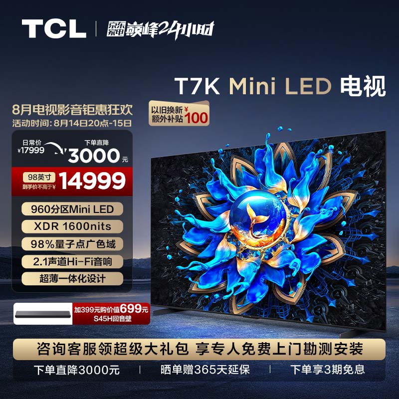 TCL电视 98T7K 98英寸 Mini LED 960分区 XDR 1600nits QLED量子点 超薄 4K液晶智能平板电视机100价格:14999.00元!