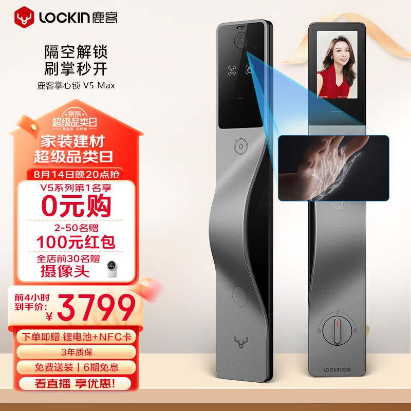 鹿客(lockin)掌心锁V5 Max掌静脉人脸识别猫眼屏电子锁APP智联适用左开价格:3799.00元!