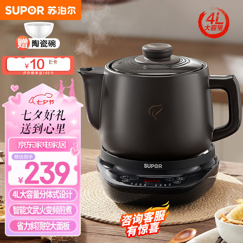 苏泊尔(SUPOR)养生壶 4L大容量煎药壶中药壶熬药锅分体式陶瓷全自动智能中药锅带底座家用 SW-40Y09价格:239.00元!